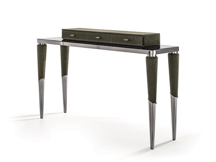 Կոնաձև սեղան՝ էլեգանտ ոտքերով, պատված կաշվով և զարդարված ալիքավոր մետաղական գլխարկով: